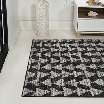 - The ivory and black color scheme reproduces the look of neutral, vintage tribal rugs