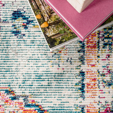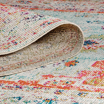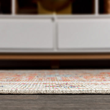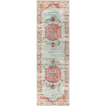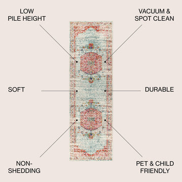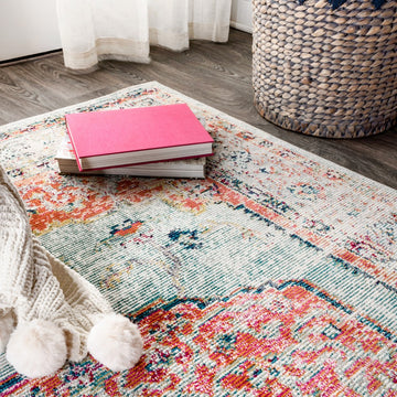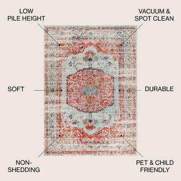 Featuring a bold central medallion reminiscent of Moroccan tile patterns, the Andalus rug adds a vintage vibe to your living room, bedroom, or den. Faded navy and sage green accent the bright shades of coral, against an ivory background. Power loomed from synthetic materials, it is as durable as it is beautiful.