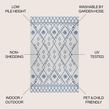 Inspired by the tile floors of Morocco, this indoor/outdoor rug adds elegant pattern to your porch, patio or sunroom. The ogee-curved trellis woven in teal adds graphic punch to a gray background. Mingled threads give this pattern a handwoven, vintage vibe that's perfect for an entry, kitchen, hallway, living room or bedroom too. The pet-friendly and kid-proof flatweave design makes it easy to clean, and perfect for the beach house.