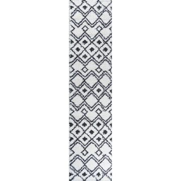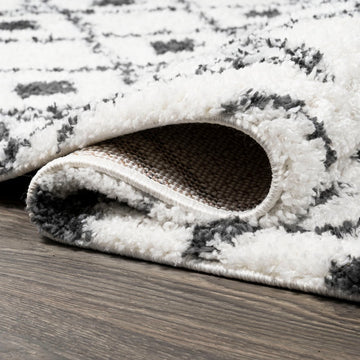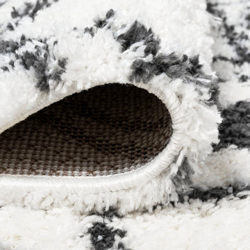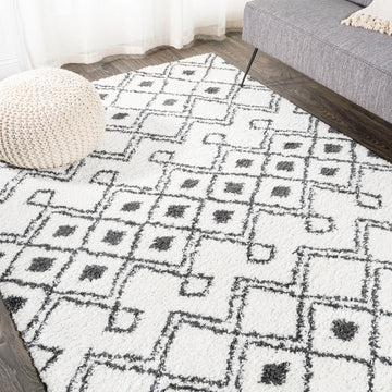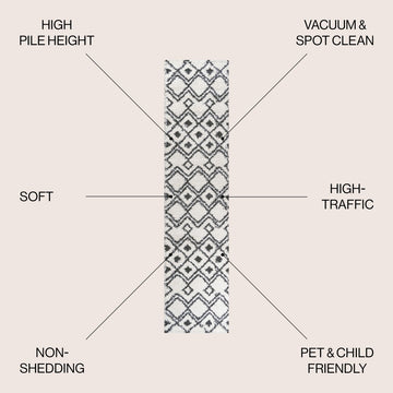 Inspired by vintage Beni Ourain Moroccan rugs, our soft and fluffy shag yarns make it easy to go barefoot. The classic Moroccan pattern has deep black diamonds and dots on a field of ivory. Anchor your Bohemian space; add softness to a bedroom, living room, or cozy reading nook; this is a low-pile shag rug with timeless style.