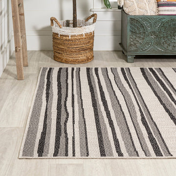 Our wavy stripe rug adds modern style to your mid-century bungalow, beach cottage or farmhouse. Our durable low pile rug features varying stripes in three contrasting colors. Add graphic punch to your living room, dining room, bedroom, or porch with this easy-care, family-friendly rug.