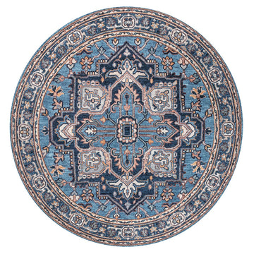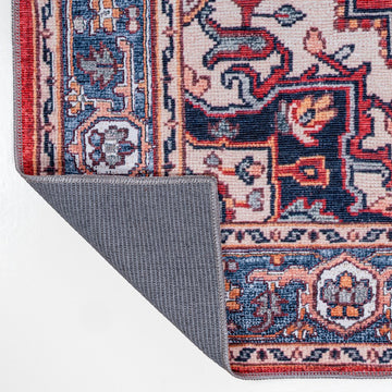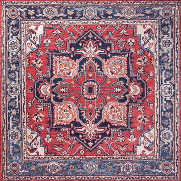 - Rust-red and navy, sky blue and cream give this classic rug its Bohemian look