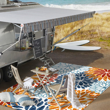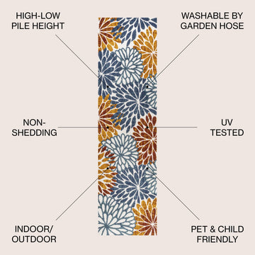 With its splashy, modern floral pattern in blue and orange, this indoor-outdoor rug has a fresh look that's ideal for a family room, dining room, bedroom, or kids' rooms. Soft, durable synthetic fibers are an easy maintenance solution for homes with kids and pets. Choose from several colorways and add a splash of style to your porch or patio.