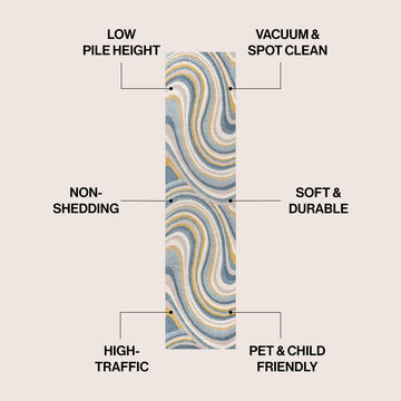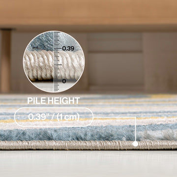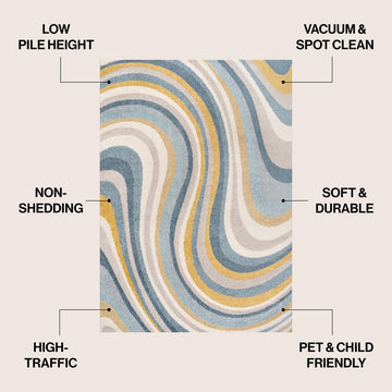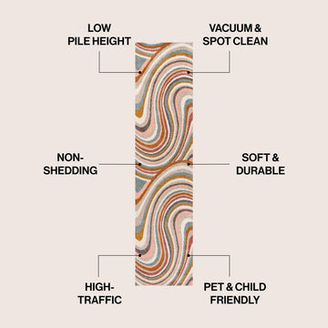 Inspired by the bold patterns of mid-century rugs, this colorful rug has a groovy, retro vibe. The busy abstract striped pattern makes it perfect for modern homes with kids and pets. It's the perfect accent for a Bohemian, mid-century or contemporary living room, dining room, bedroom or home office.