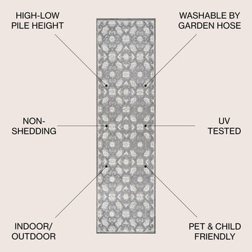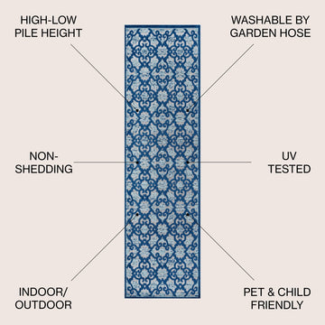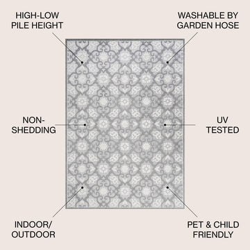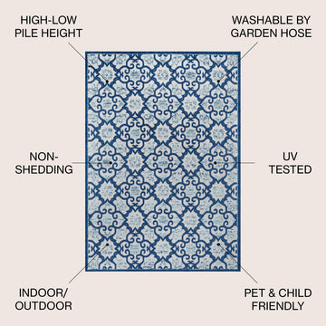 Inspired by antique Mediterranean tile patterns, this indoor-outdoor rug adds classic style to a kitchen, living room, bedroom or dining room. The all-over design is an easy maintenance solution for homes with kids and pets. Outdoors, this trellis patterned rug adds well-traveled chic to a porch or patio.