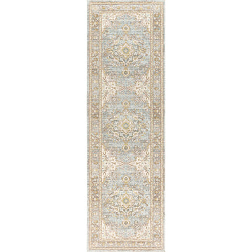 Our shabby-chic version of a traditional floral medallion design, this soft blue rug has coastal colors and cottage flair. It's been created with mingled and faded tones for a vintage, flea-market look. Layer this stunning rug in your bedroom, living room, dining room or den.