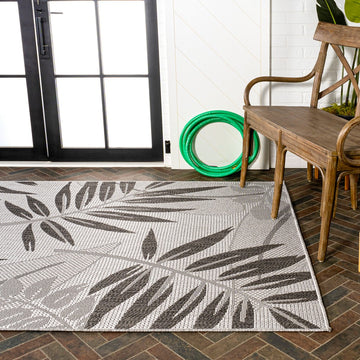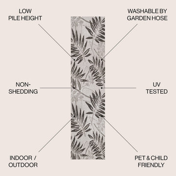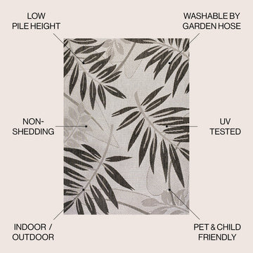 Whether you live in a tropical beach cottage or just love jungalow style, the palm leaf pattern of this rug brings the jungle home. Overlapping palm tree branches and jungle leaves create an elegant two-tone pattern. The pet-friendly and kid-proof low-pile design is perfect for the living room, dining room, kitchen, or porch.
