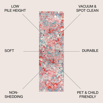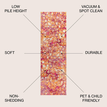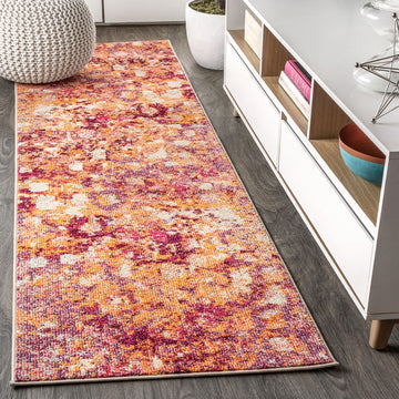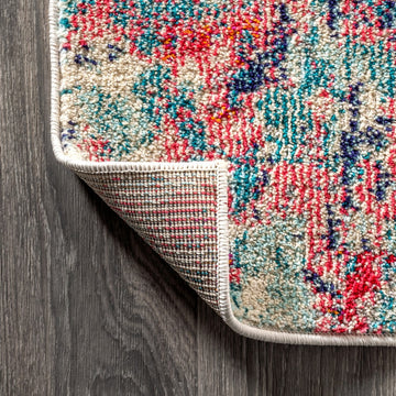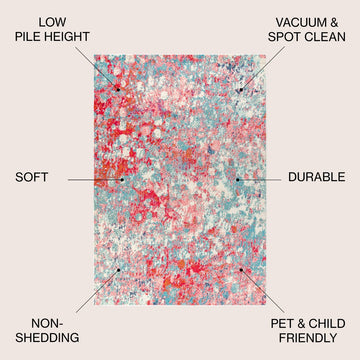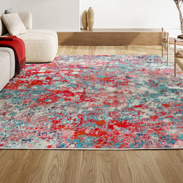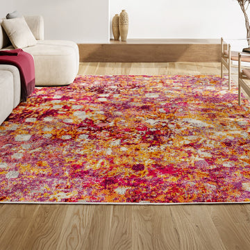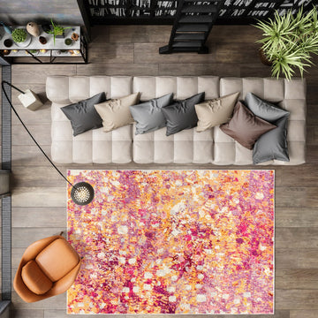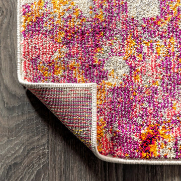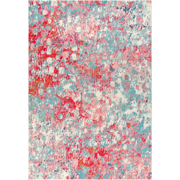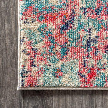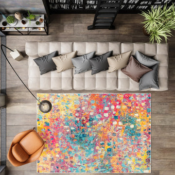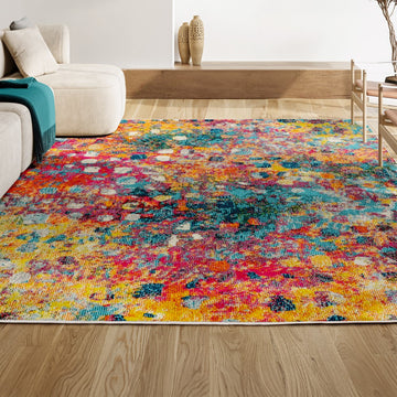 Dabs of colorful paint on canvas inspired this gorgeous rug -- an artistic masterpiece -- for your floors! Like a bed of spring flowers, the gold, blue, pink, aqua, cream, and yellow polypropylene yarns come together to create a fresh, feminine look that will liven any decor. Power loomed for durability, it won't only stand out but will also withstand cleaning, high traffic, and the occasional spill.