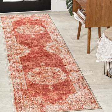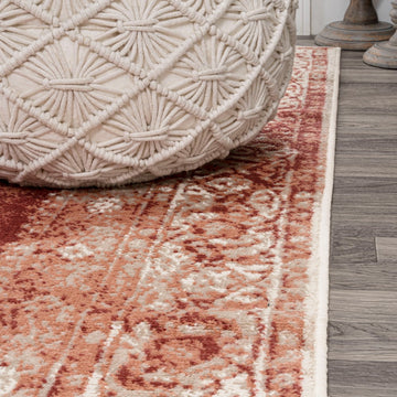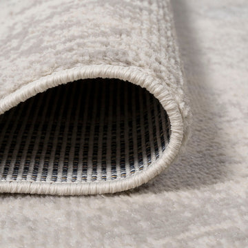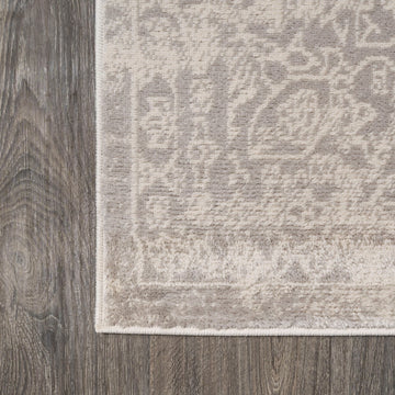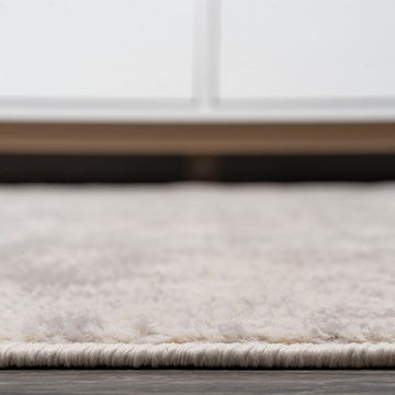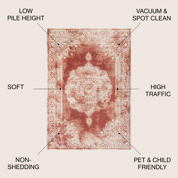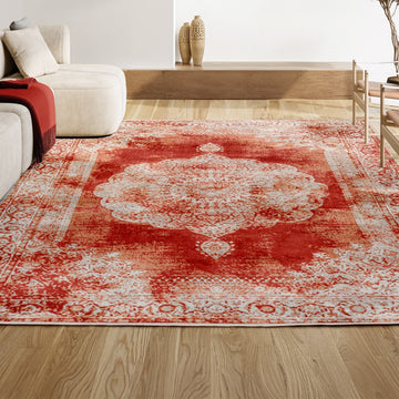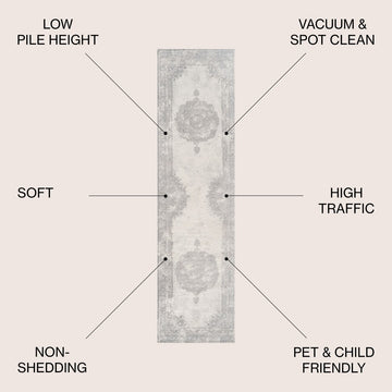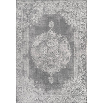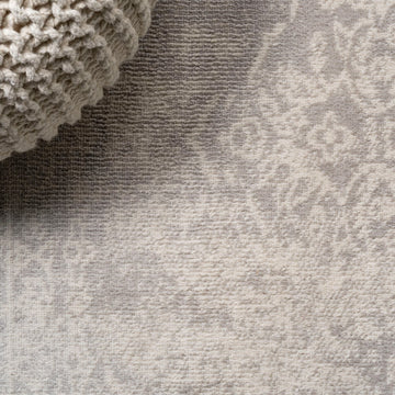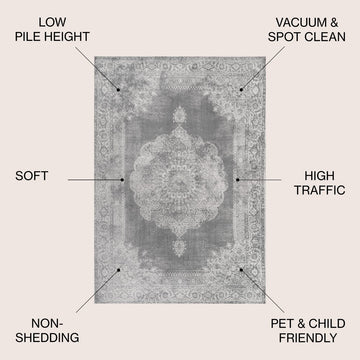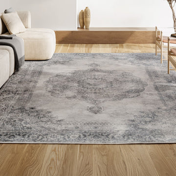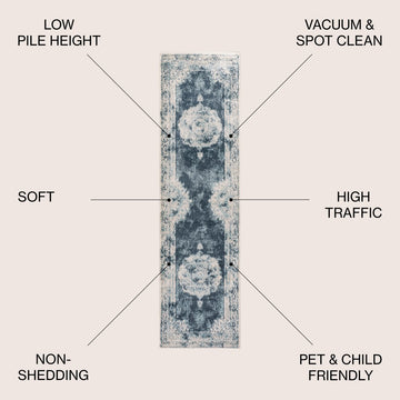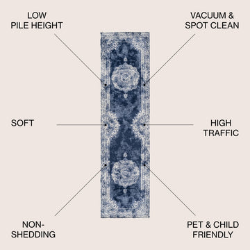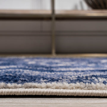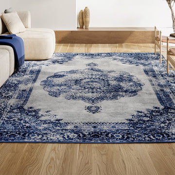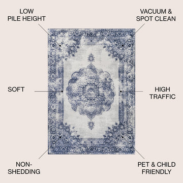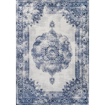 This ornate medallion rug has a scroll and floral pattern, adding modern Bohemian cottage style to a living room, bedroom, entry or kitchen. Varied tones of denim blue on an ivory background give this rug a hand-woven, rustic look. The busy allover pattern is pet-friendly and great for kids too.