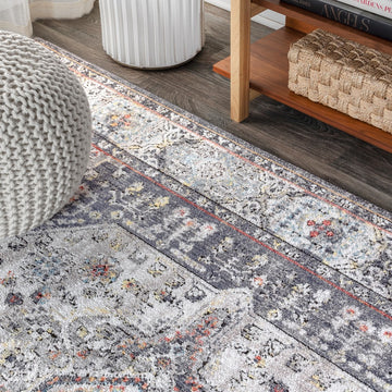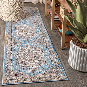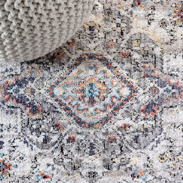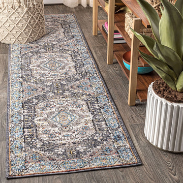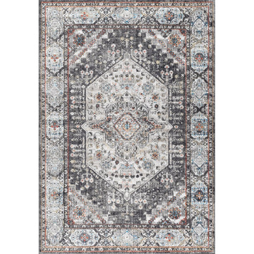Based on a timeless medallion rug design, Kesan is updated with light and bright turquoise, gray and ivory. A central medallion in gray and ivory sits on a mingled turquoise background, and a medallion border completes the design. Varying shades of color create a worn, vintage look.