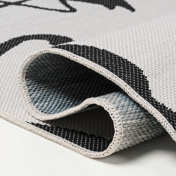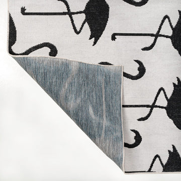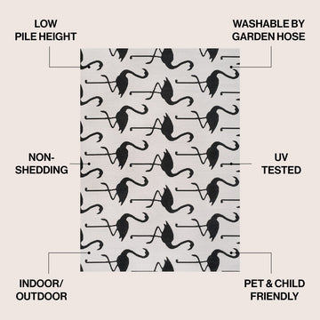 The bold pattern of this classic rug is inspired by the heyday of Florida style. It's made from durable synthetic fibers woven into rows of tropical flamingos. Use this stylish rug outdoors, or in the bedroom, living room or dining room.