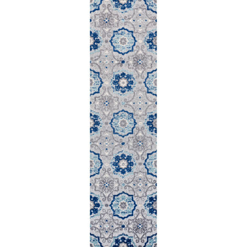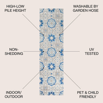 Inspired by the tile floors of Italy and Morocco, this flatweave rug adds rich pattern underfoot. Ogee curves, and medallions in shades of blue and dance against a neutral khaki ground. The pet-friendly and kid-proof flatweave design makes it easy to clean.