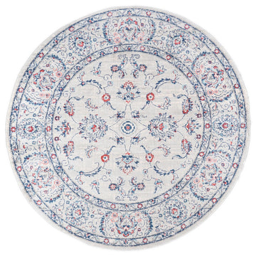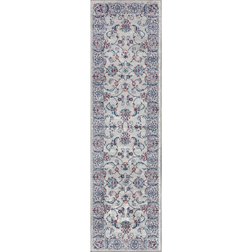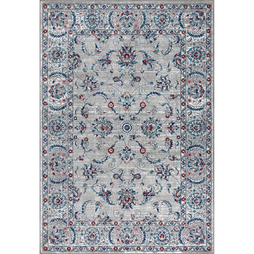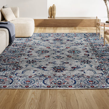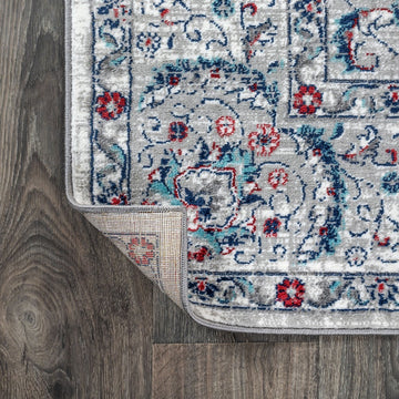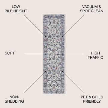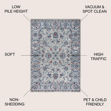 - The gray base is accented with notes of pink and blue throughout the Persian-inspired design
