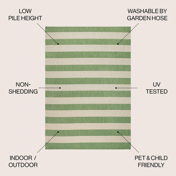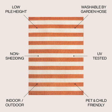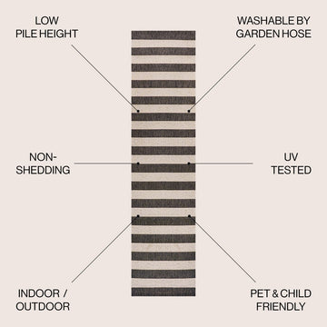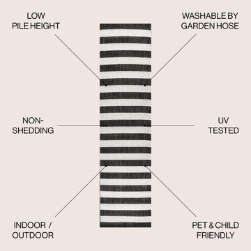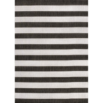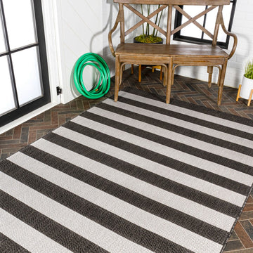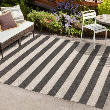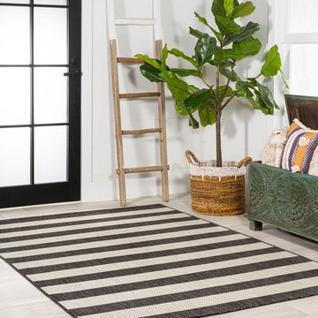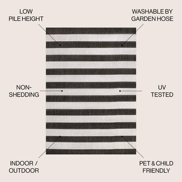 Bring home a timeless stripe rug for your modern cottage, beach bungalow or farmhouse. Our durable low pile rug features wide, woven stripes in two contrasting colors. Add graphic punch to your living room, dining room, bedroom, or porch with this easy-care, family-friendly rug.