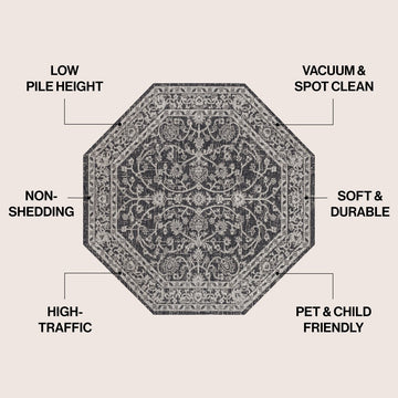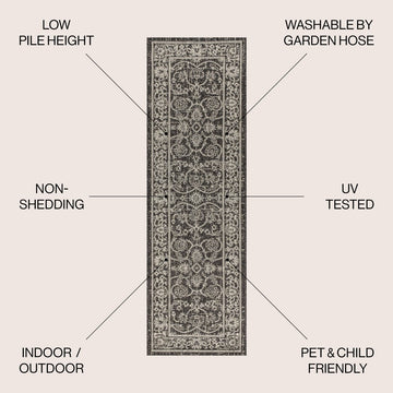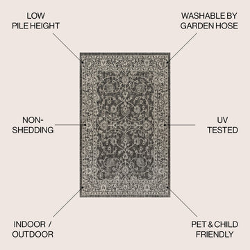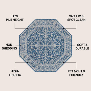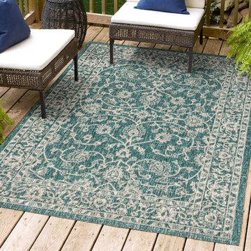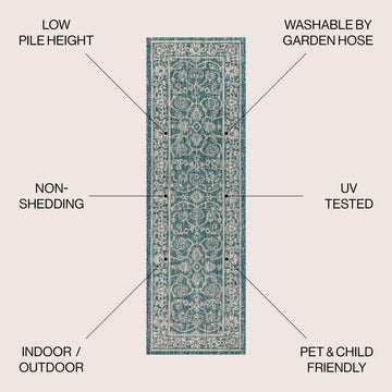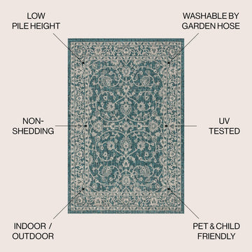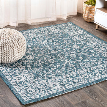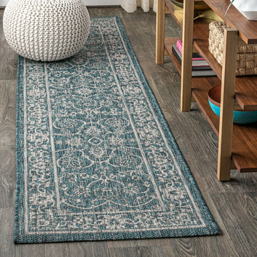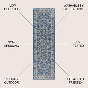 With its twining vines and ornate border, this traditional pattern is an elegant addition to your outdoor porch or patio. Varied tones of blue and navy mingled with a light gray pattern give this rug a rich, hand-woven texture. The flatweave design is great for high-traffic spaces indoors too.