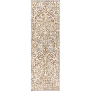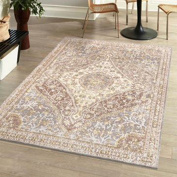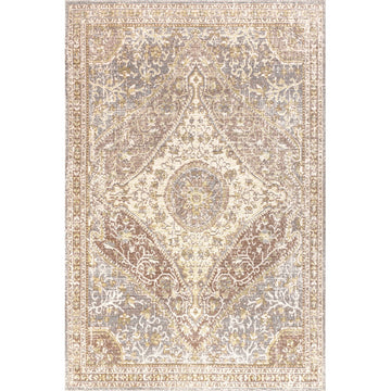 Ornate medallions in the center of this design recall vintage Turkish rugs, but the color palette is modern. Neutral gray-brown mingles with ivory for a distressed look. Use this stylish rug in a city apartment or coastal home, for a bedroom, living room, dining room or den.