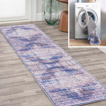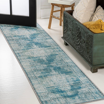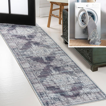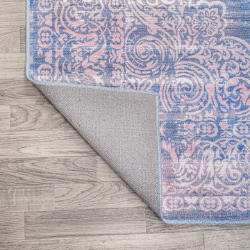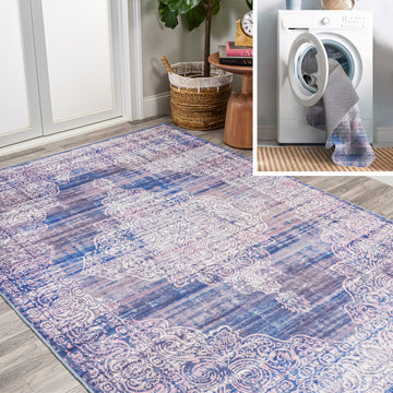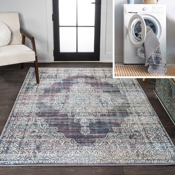 An ornate border and medallion design give this rug a French Country cottage look; but the faded color palette has a Bohemian vibe. Updated colors in a mingled weave create a vintage, distressed look. Use this romantic rug in a family room, bedroom, living room, dining room, entry, or porch; the busy pattern is kid and pet friendly.