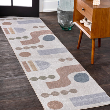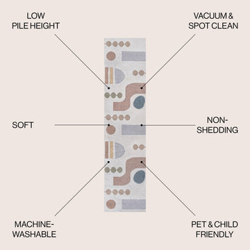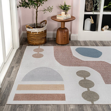 This kid-friendly, washable rug features a modern color palette and abstract shapes. With its contemporary pattern, our rug is ideal for any kids room, family room, or playroom. The pet-friendly synthetic fibers are easy to clean, making this rug the perfect choice for busy families.