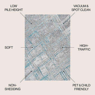 Mingled threads of turquoise, gray and ivory create a modern, abstract linear design with a mid-century look. This rug's unique crisscrossing pattern makes it perfect for homes with kids and pets. It's the ideal centerpiece for a contemporary, coastal or minimalist interior.