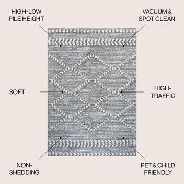 Mingled threads form diamond trellis on this modern version of a Moroccan rug design. The geometric pattern is practical for busy families, and adds texture to the living room, bedroom or home office. This versatile rug fits in anywhere, from a modern, minimalist interior to a Boho loft or coastal cottage.