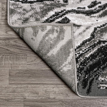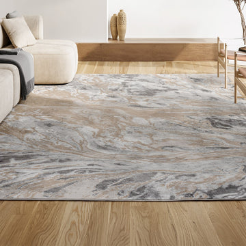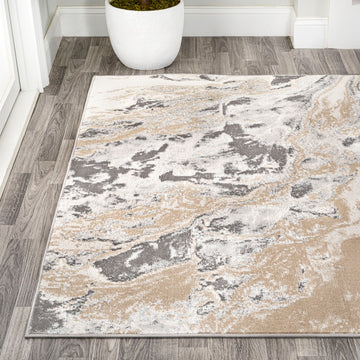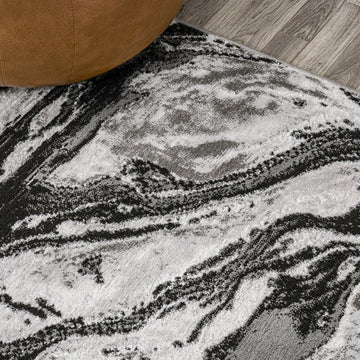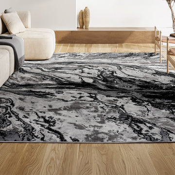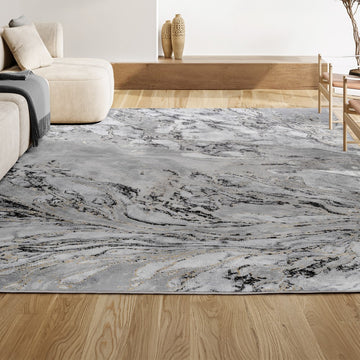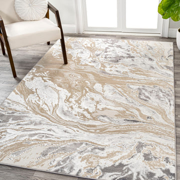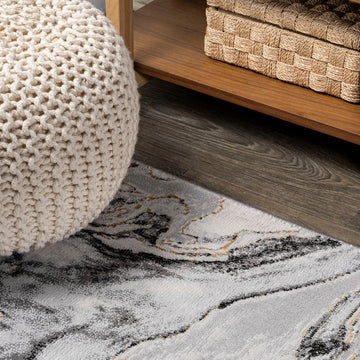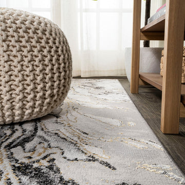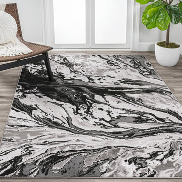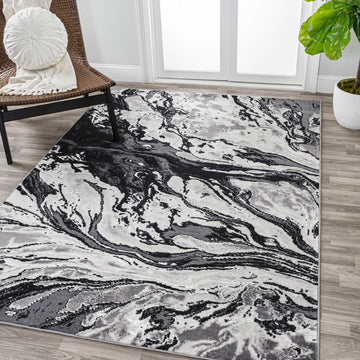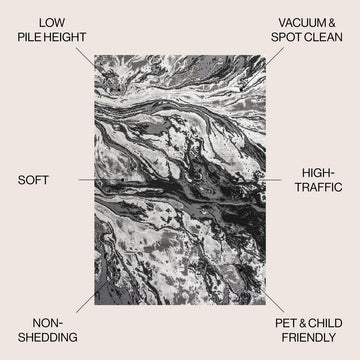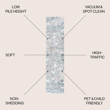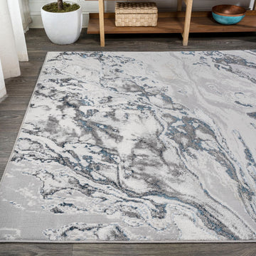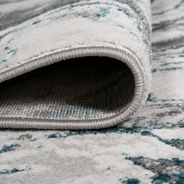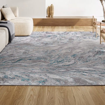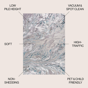 Inspired by the abstract designs of marbled papers, this bold rug has a modern, coastal vibe. Deep turquoise and gray swirl across an ivory background. This unique rug's overall pattern makes it perfect for homes with kids and pets. It's the perfect centerpiece for a mid-century modern, contemporary, beach house or minimalist interior.