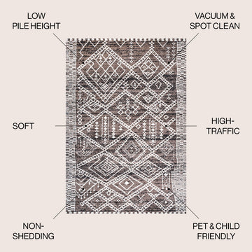 Inspired by vintage Moroccan rugs, our easy-care rug has a soft, low pile. The rich brown and ivory pattern features a tribal design of diamonds and geometric shapes woven with a distressed look. Anchor your modern Bohemian space; add softness to a bedroom, living room, dining room, kitchen or entry; this is a durable rug with timeless style.