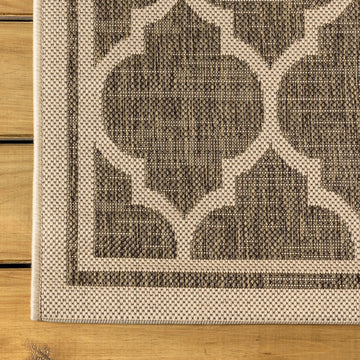 Our popular geometric design is inspired by Moroccan tile patterns. This classic rug adds eclectic style to an outdoor porch or patio. Mingled tones of deep brown with a beige ogee trellis pattern give this rug a hand-woven texture. The flatweave design is great for high-traffic spaces indoors too.