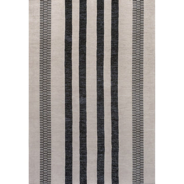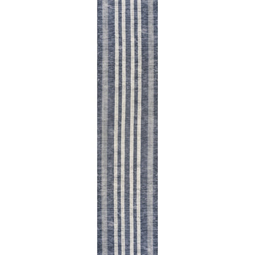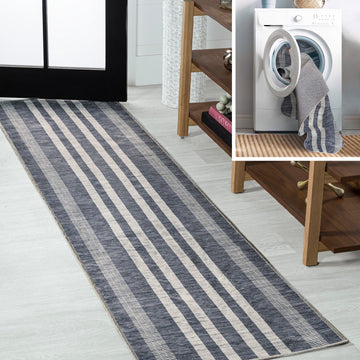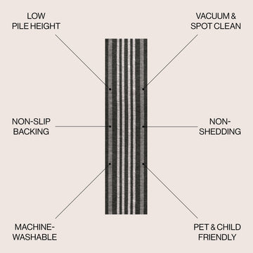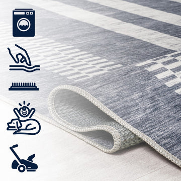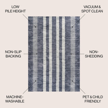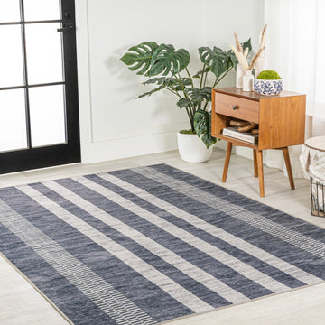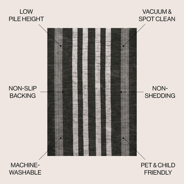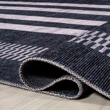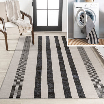 Our striped rug's geometric details add modern style to your mid-century ranch, farmhouse or city loft. The wide woven stripes have rectangular elements that add to the handcrafted look. This durable, machine washable rug adds graphic punch to a living room, dining room, bedroom, or kitchen.