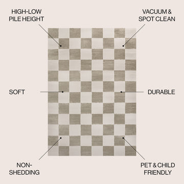 This casual rug features a geometric checkerboard pattern and a crisp two-tone color scheme. The family-friendly design is woven from plush polyester, with a high-low pile that accentuates the pattern. Make a bold statement in the bedroom, living room or dining room with this unique modern rug. Please note that variations in the rug's appearance may occur when the fibers are brushed due to natural light reflection and weaving characteristics.