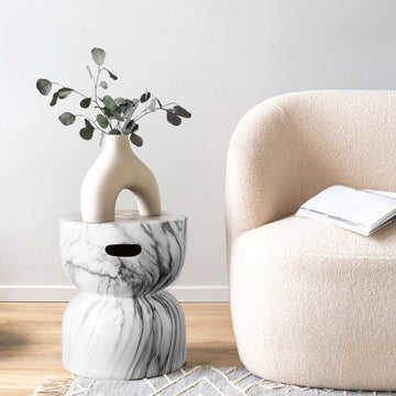 With its classic mid-century silhouette, this garden stool has a chic minimalist design. The glazed ceramic pattern mimics natural marble. Set one beside a bedroom chair, or use a pair in front of a contemporary living room sofa.