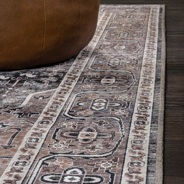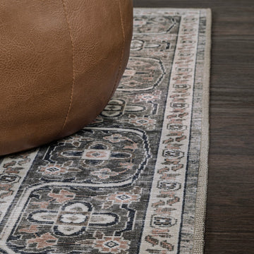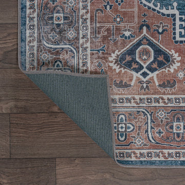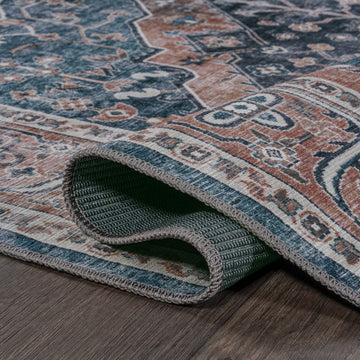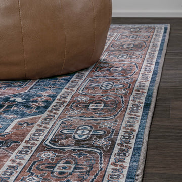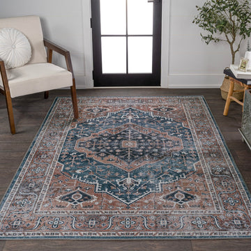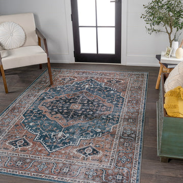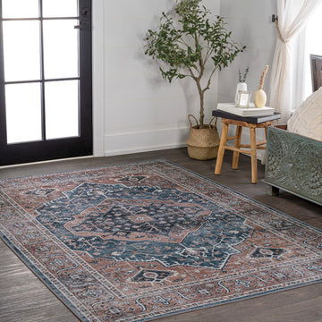 The ornate ogee medallion in the center of this rug recalls ancient Persian rug designs. Updated colors add a modern Bohemian-inspired twist to a classic design. With its pet-friendly pattern, this easy-care rug would be perfect for a dining room, living room, entry, bedroom or porch.