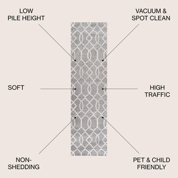 Our geometric trellis design is inspired by gray and white Moroccan tile patterns - the perfect complement to traditional, modern and coastal interiors. The ogee trellis in ivory is backed with mingled tones of blue to give this rug a vintage look. This family-friendly rug is ideal for the living room, kitchen, dining room, bedroom or entry.