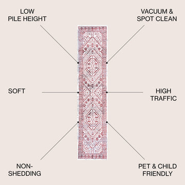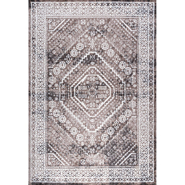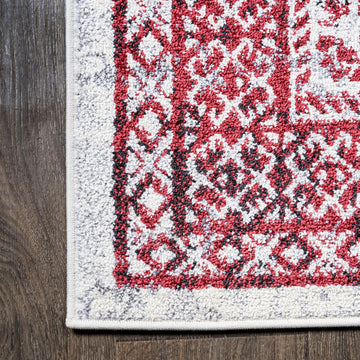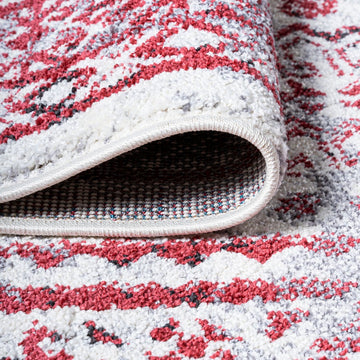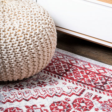 This ornate medallion rug has a geometric pattern that adds modern Bohemian style to a living room, bedroom, entry or kitchen. Varied tones of red mingled with a gray and ivory background give this rug a hand-woven, vintage vibe. The busy allover pattern is pet-friendly and great for kids too.