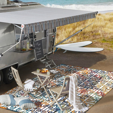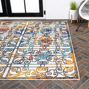 Inspired by scrolling Mediterranean wrought iron, this indoor-outdoor rug will cheer up a kitchen, living room, bedroom or dining room. The multicolored design is an easy maintenance solution for homes with kids and pets. Outdoors, this rug adds a splash of color and Bohemian style to your patio or porch.