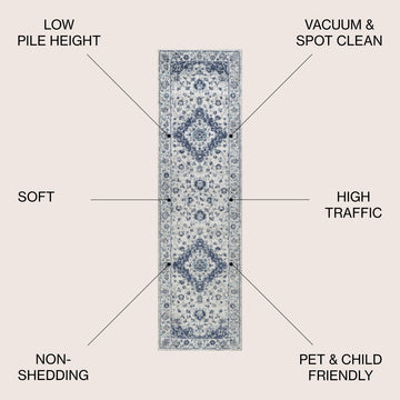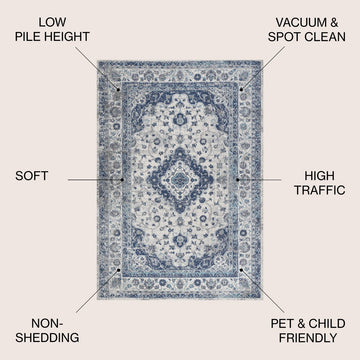A classic medallion design gets a cottage makeover in French Country blues. The ornate pattern features a central medallion and border, with vines and flowers in an updated palette of dark blue, light blue and gray. Mingled threads create a slightly distressed look. Add a traditional touch to your living room, family room, bedroom, dining room, or home office with this durable, family-friendly rug.