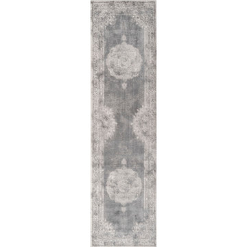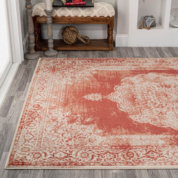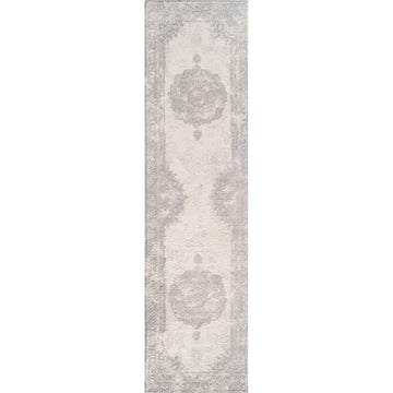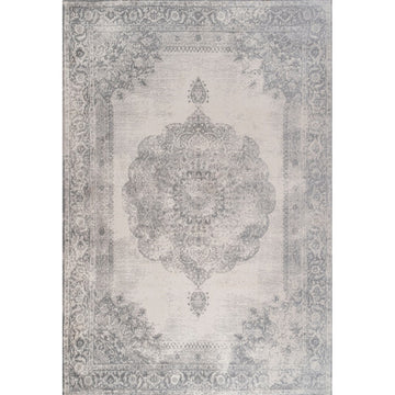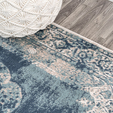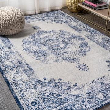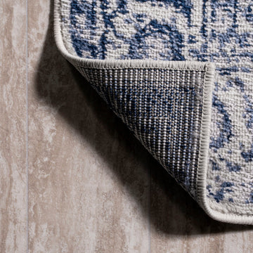 This ornate medallion rug has a scroll and floral pattern, adding modern Bohemian cottage style to a living room, bedroom, entry or kitchen. Varied tones of denim blue on an ivory background give this rug a hand-woven, rustic look. The busy allover pattern is pet-friendly and great for kids too.