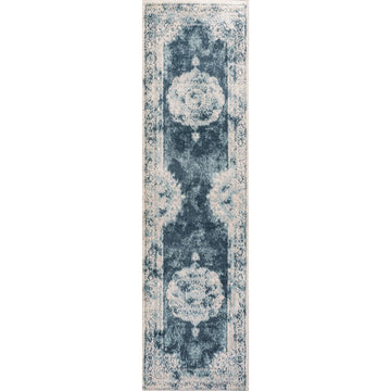 - Mingled denim blue and navy on an ivory background give this rug a vintage texture