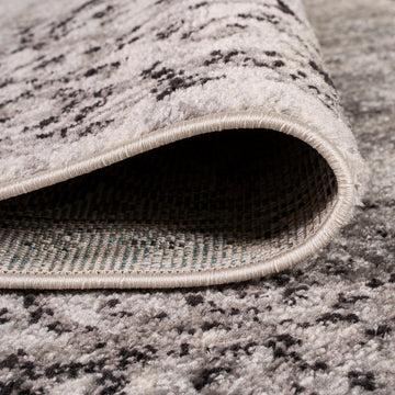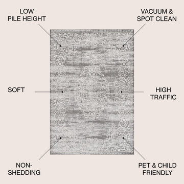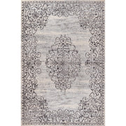 - This rug has a dark gray pattern on a mingled background of light gray and ivory for a vintage look