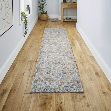 - The blue and light gray color scheme is a rustic take on mid-century rugs