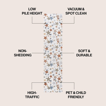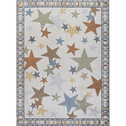 This kid-friendly, washable rug features a modern color palette and a field of bold stars. With its busy pattern, our classic rug is ideal for a kids room, family room, home office, or playroom. The pet-friendly synthetic fibers are easy to clean.