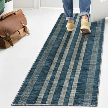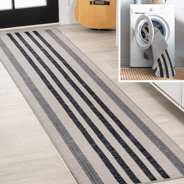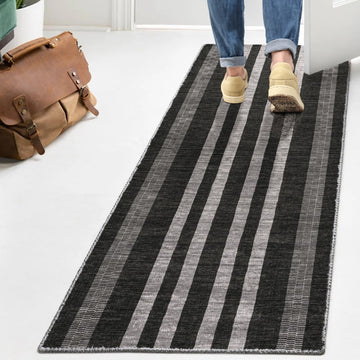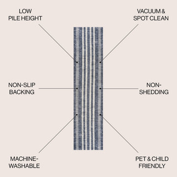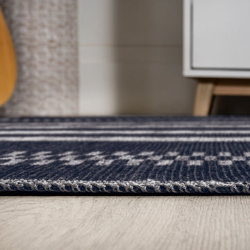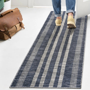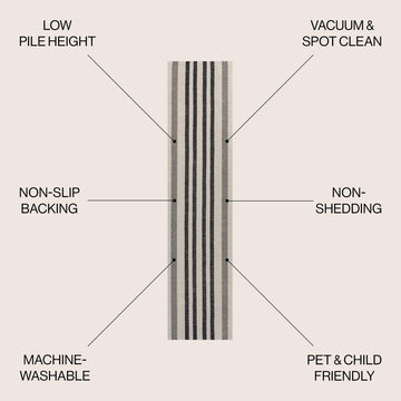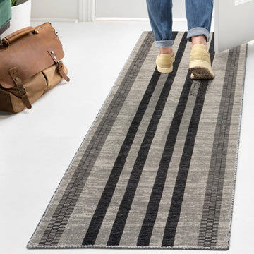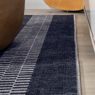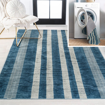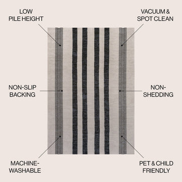 Our striped rug's geometric details add modern style to your mid-century ranch, farmhouse or city loft. The wide woven stripes have rectangular elements that add to the handcrafted look. This durable, machine washable rug adds graphic punch to a living room, dining room, bedroom, or kitchen.