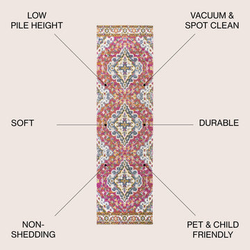 - Combining tones of pink, blue, orange and gold, this rug is a versatile addition to any color scheme