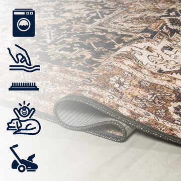Our Persian chenille rug boasts a bold color palette and medallion design. This durable, machine-washable rug is a perfect addition for any busy family. This timeless rug enhances any mid-century or traditional home.