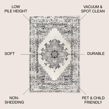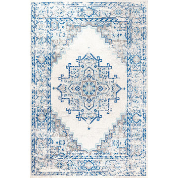 The diamond-shaped medallion in the center of this rug's design recalls ancient geometric tribal rugs. The neutral ivory and blue color scheme adds a modern update to a classic design. With its Bohemian-inspired, minimalist design this rug would be perfect for a dining room, living room, entry or bedroom.