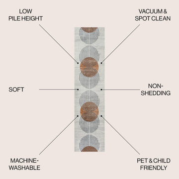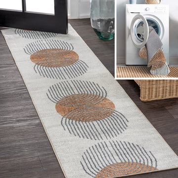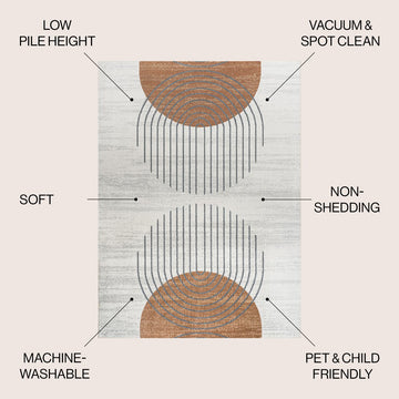 This washable rug features a modern color palette and geometric arch design. With its contemporary pattern, our rug is ideal for a kids room, family room, home office, or playroom. Made of pet-friendly synthetic fibers, the rug is durable and easy to clean.
