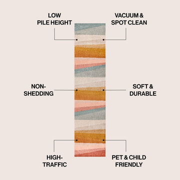 This colorful rug combines geometric angles and stripes for a colorful retro vibe that recalls bold mid-century rug designs. This modern, abstract rug's busy pattern makes it perfect for homes with kids and pets. It's the perfect accent for a mid-century modern or contemporary living room, dining room or bedroom.
