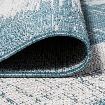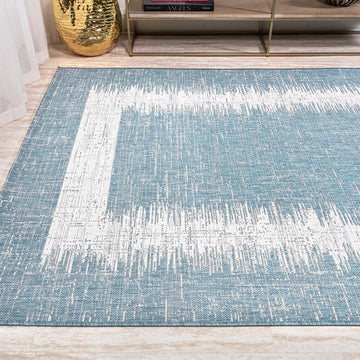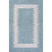 A simple ivory border is woven with a strie' effect on this seafoam aqua geometric rug. This versatile rug's minimalist look is perfect for a coastal cottage or modern outdoor patio. The solid, plain design is a family-friendly solution for a Scandinavian style living room, modern bedroom, kitchen hallway, entry or kids bedroom. The pet-friendly and kid-proof flatweave design makes it easy to clean, and perfect for the beach house.
