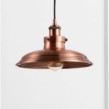 This small industrial pendant light dresses up your kitchen with a warm copper finish. The industrial metal shade and round bulb with deflector add vintage flair. Line them up over a kitchen island, bar, or dining table. Includes a dimmable LED bulb and 6-foot black cord. Perfect for rustic and farmhouse look.