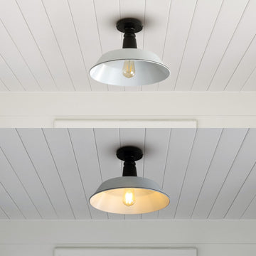 - Add vintage charm to any room with this ceiling light's wide metal shade and two-tone color scheme in classic white and black