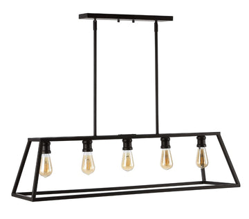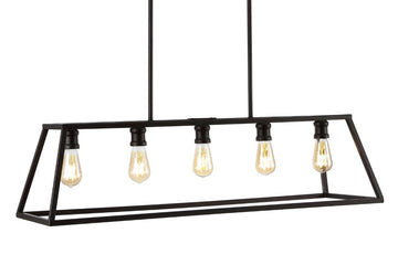 Perfectly sized for over a kitchen island, kitchen table or cottage dining room, this pendant lantern is only about four feet long. The simple black metal frame features five Edison-style LED bulbs for an industrial touch. This versatile linear pendant is ideal for modern, minimalist dining rooms as well as rustic, industrial spaces.